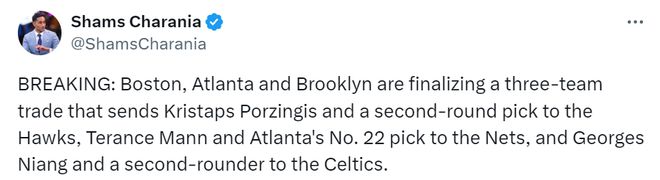 Shams:绿军&老鹰&篮网在敲定三方交易 将波津+次轮签送去老鹰